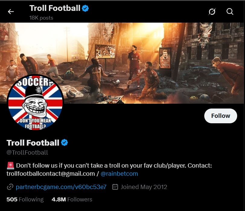 Backed by @TrollFootball (4.8M followers on X) – one of the largest football meme brands in the world.